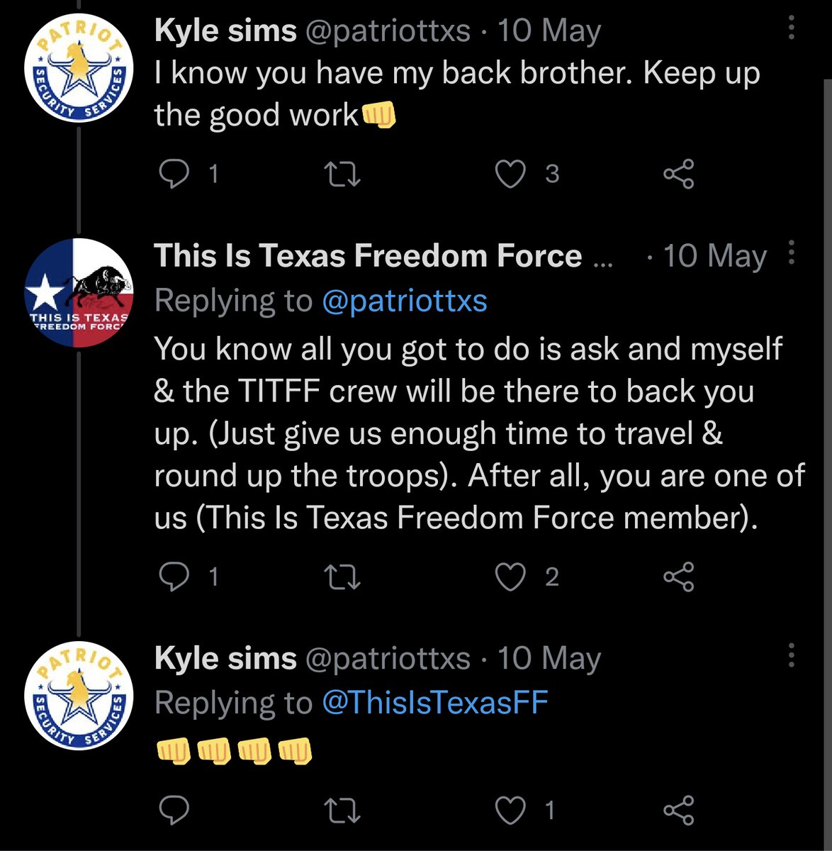 CORRECTION: a previous now deleted Tweet incorrectly associated Kyle "KD" Sims with a Confederate Veterans organization that has collaborated with This Is Texas Freedom Force. That Confederate Veterans group in north Texas features another man named Kyle Sims. I regret the error.