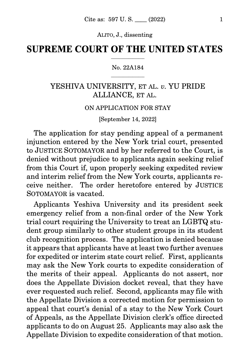 BREAKING: #SCOTUS denies a stay to Yeshiva University in its fight over recognizing an LGBTQ club, with the 5-4 majority saying the school should seek relief from NY state courts first. A trial court judge in NY has ordered the school recognize the club.