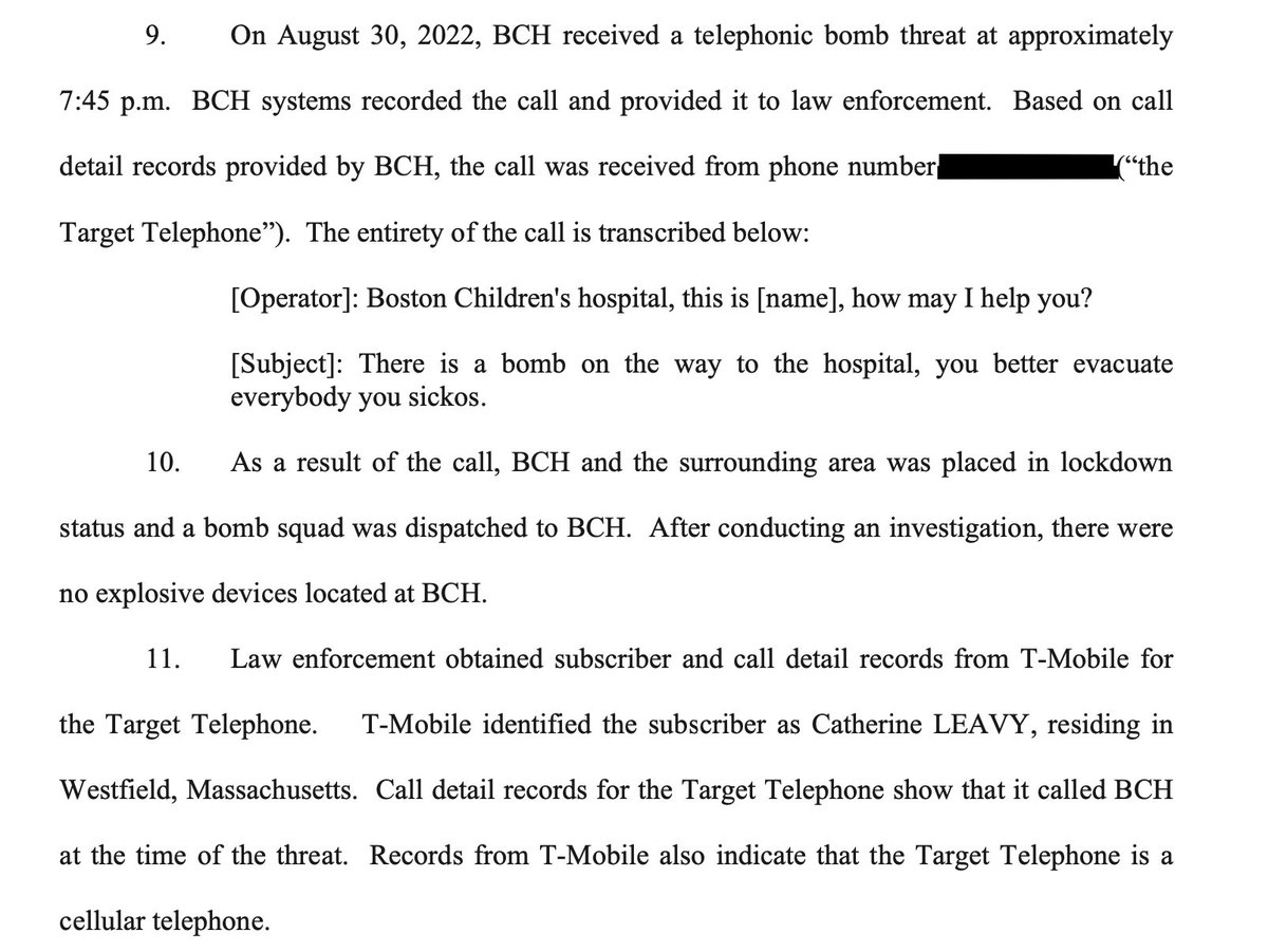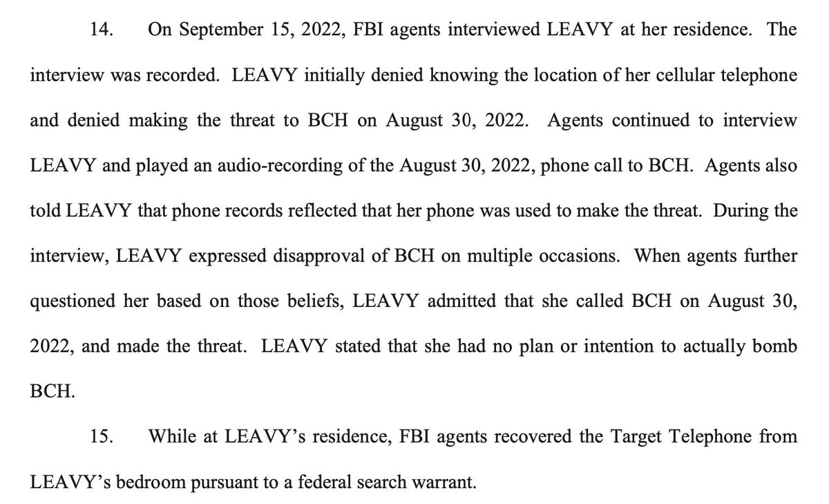 JUST IN: According to the FBI affidavit filed in Leavy's case, she "initially denied" — in an interview earlier today — knowing where her phone was and denied "making the threat to BCH on August 30, 2022." She later admitted to making the threat, according to the affidavit.