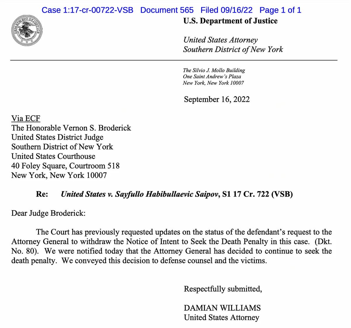 “[T]he Attorney General has decided to continue to seek the death penalty” in the case of Sayfullo Saipov, the man accused in the October 2017 deadly terror attack along a bike path in Manhattan. The court and Saipov were informed on Friday. lawdork.com/p/the-biden-ad…