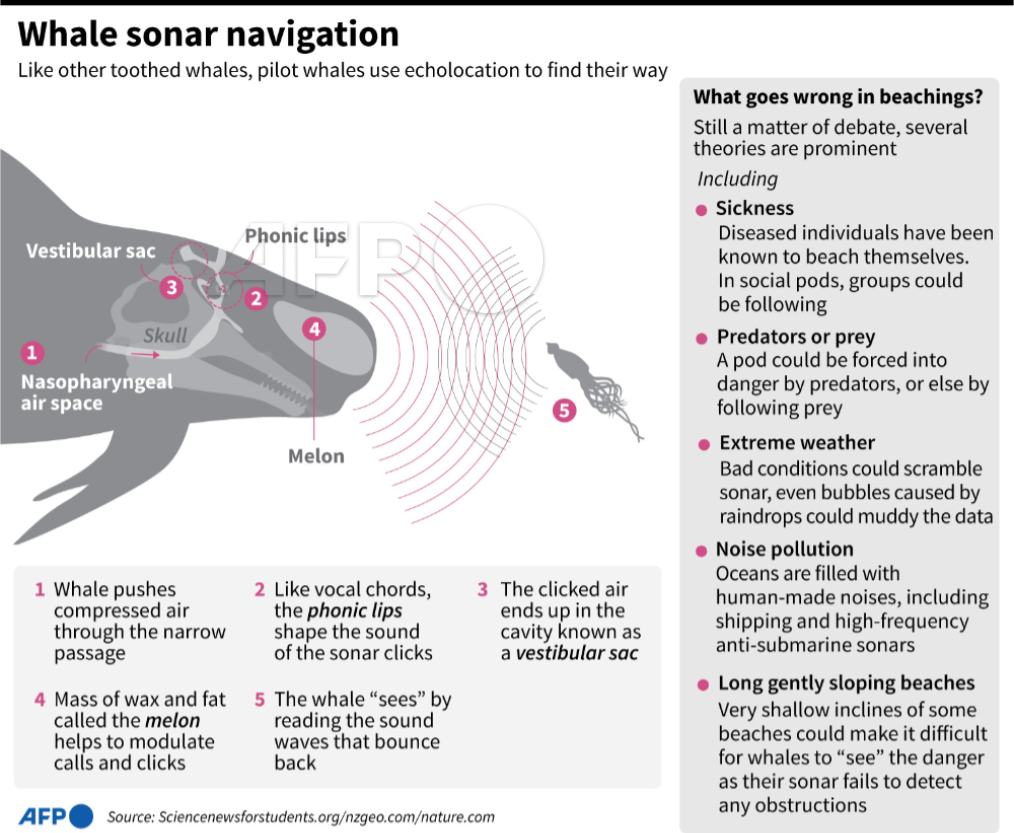 Graphic looking at how pilot whales use echolocation to navigate underwater. #AFPgraphics@AFP