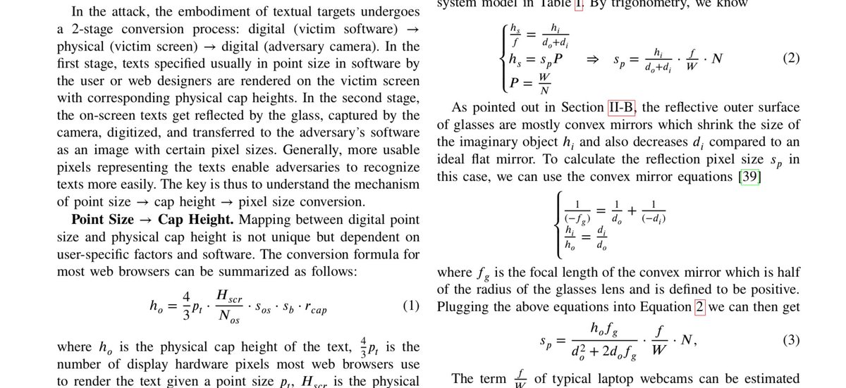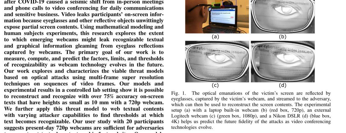 Users of glassess beware! You may be leaking secret data during Zoom/Skype/etc videoconferences. Screen reflected in glasses, then visible during a videoconferencing. School-grade physics/optics sufficient to understand the exploit equations. arxiv.org/pdf/2205.03971…