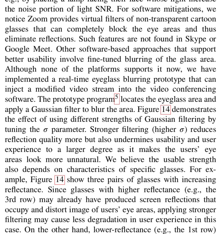 Solution/mitigation? Use a lamp. Or face bluring “reduce reflections’ light SNR, e.g., by placing a lamp facing their face whose light increase the noise portion”. Seriously this isn’t funny: if information may be leaking due to the use technology, it makes sense to do SOMETHING