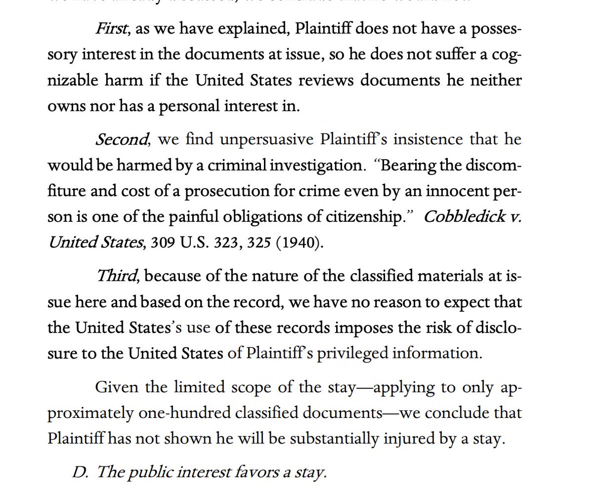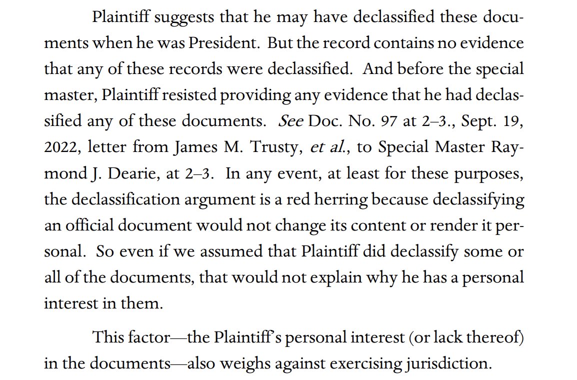 MORE: The appeals panel calls the issue of declassification a "red herring," noting that even if true, Trump would still have no personal interest in retaining the records. politico.com/news/2022/09/2…