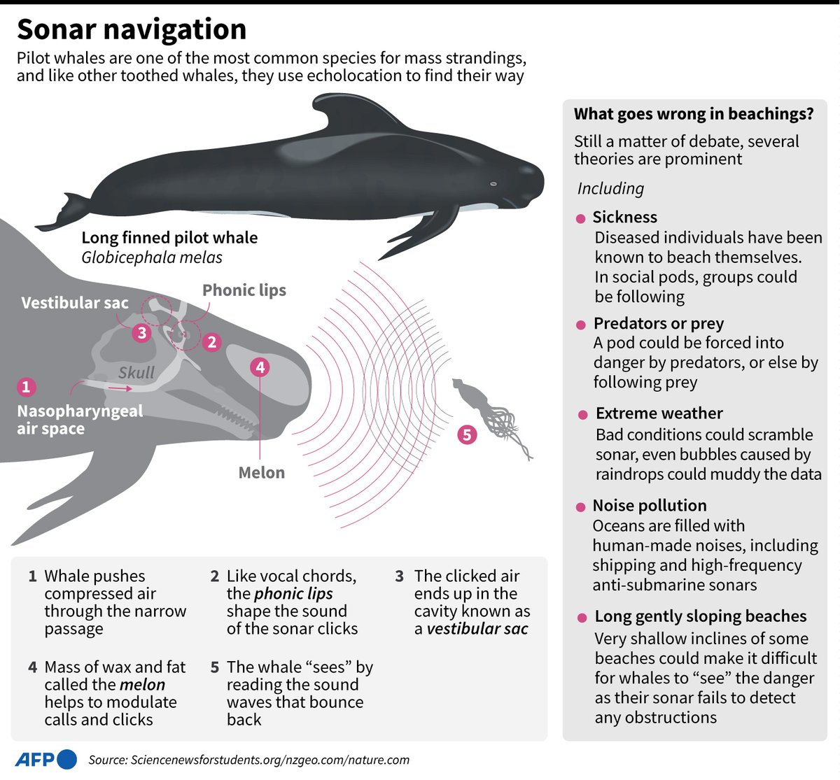 #AFPGraphics looks at how pilot whales use echolocation to navigate underwater, and listing various theories about what could go wrong to lead to strandings.
