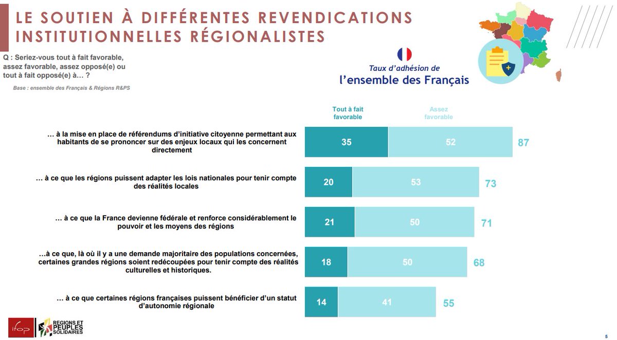 👉Le soutien au renforcement du rôle des régions dépasse largement les clivages politiques et générationnels. 71 % des Français souhaitent que leurs régions disposent de plus de compétences. Ce désir est particulièrement fort dans les territoires à forte identité culturelle : 86 % en Alsace, 78 % en Bretagne, 76 % en Corse.