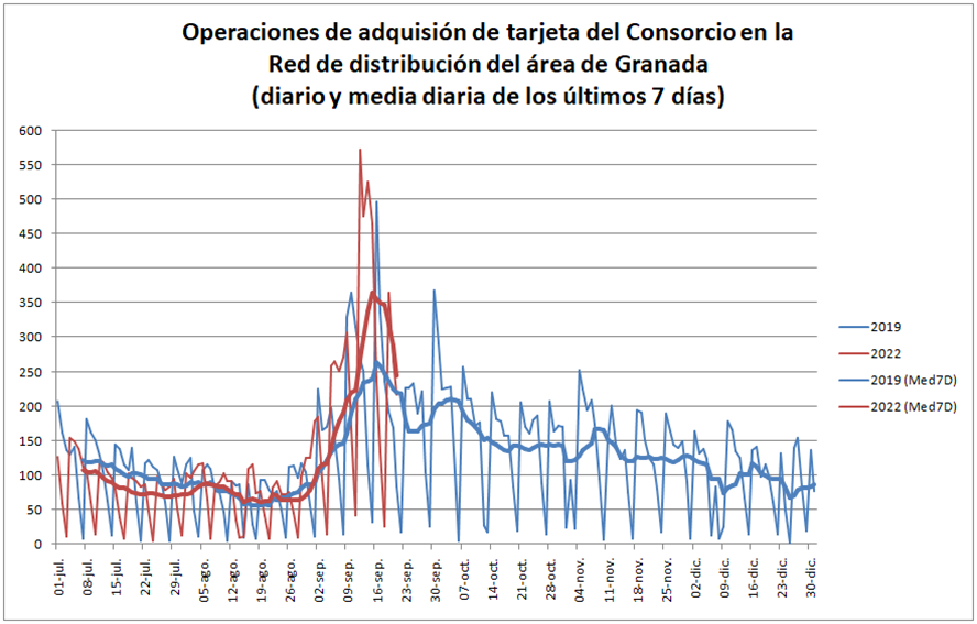La evolución de emisión de tarjetas según tipologías (Ordinaria, Familia Numerosa, Joven) no es muy diferente entre unas y otras, así que el efecto parece ser generalizado. (Datos jul-sep 2022).