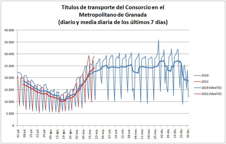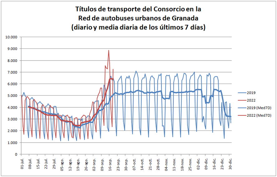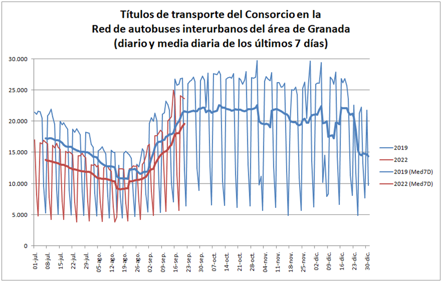 Esta reducción ha afectado en su conjunto a un número importante de títulos. Teniendo en cuenta los valores de 2021, estos se utilizan en 3/4 partes del total de accesos en el conjunto de los transportes públicos colectivos de Granada y su área metropolitana.