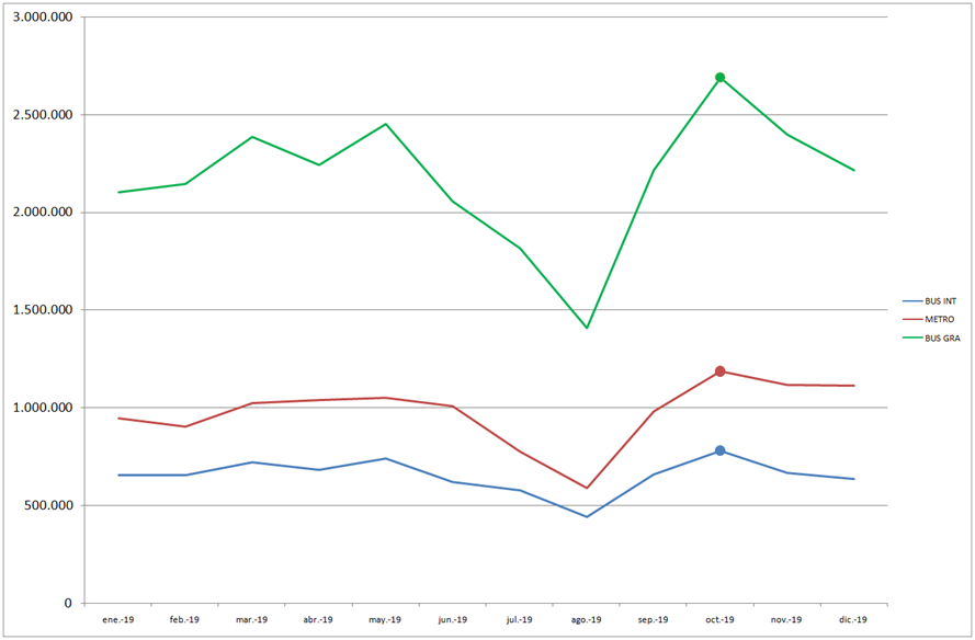 Distribución mensual (2019) de los usuarios en los 3 principales sistemas de TP de Granada:
