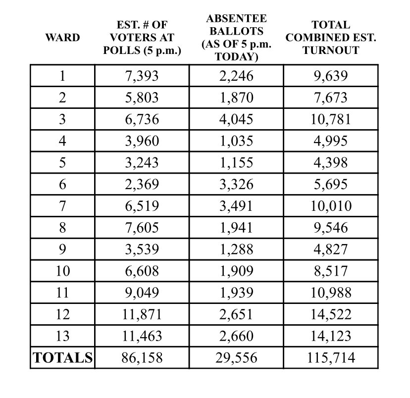 This is a look at voter turnout by Ward as of late afternoon.