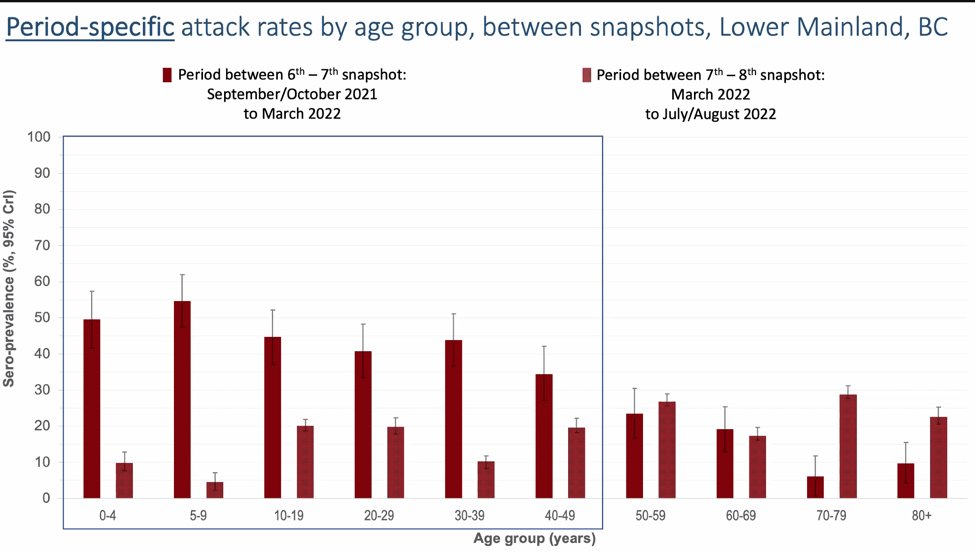 Another @CDCofBC slide, from Sept/Oct. 2021 to March 2022 , children were group most acutely infected with #COVID. % are in fact underestimation of real jump in VCH-FHA general community seroprevalence. Children attack rate > than parents age = School Transmission.