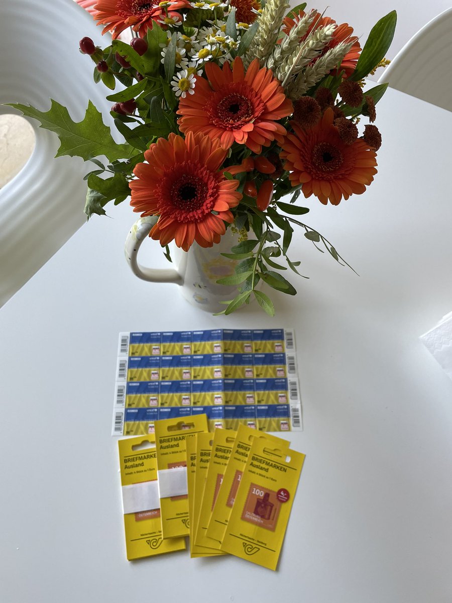 Such a tough morning and I come back to lovely surprises: STAMPS! Thank you so much! I had literally run out. You guys are the best. Flowers were a gift from a Ukrainian artist after I bought a small painting this week from her.
