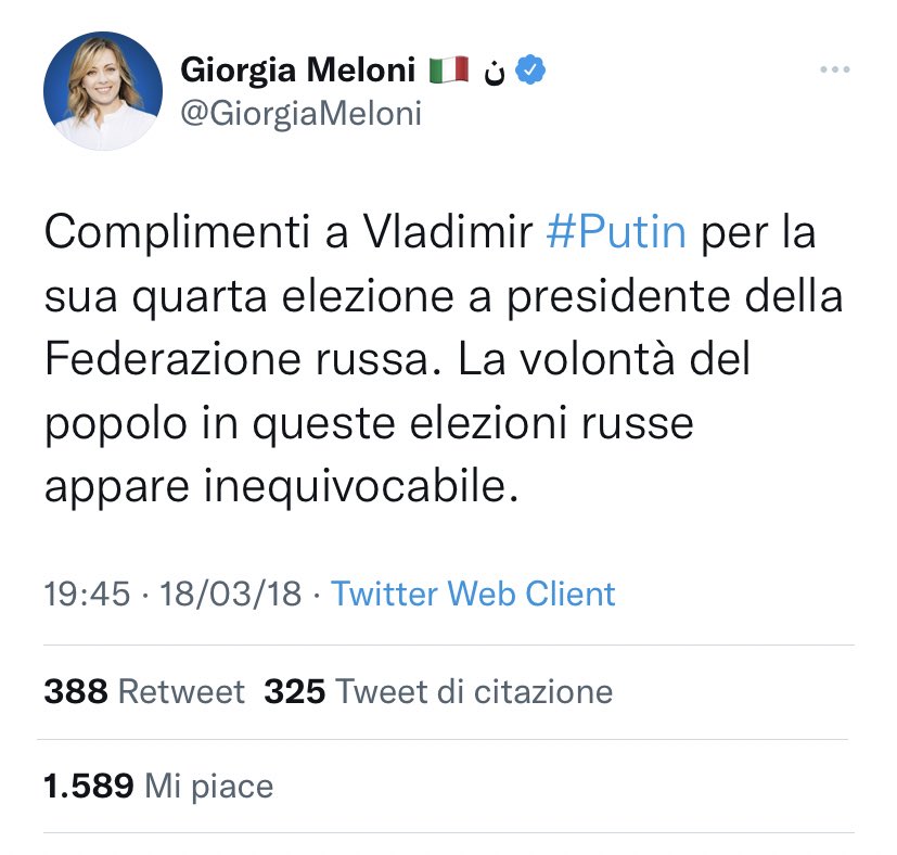 Meloni now has a pro-Ukraine stance. But wait: in 2014 she supported Crimea annexation and in 2018 she praised Russian democracy.
