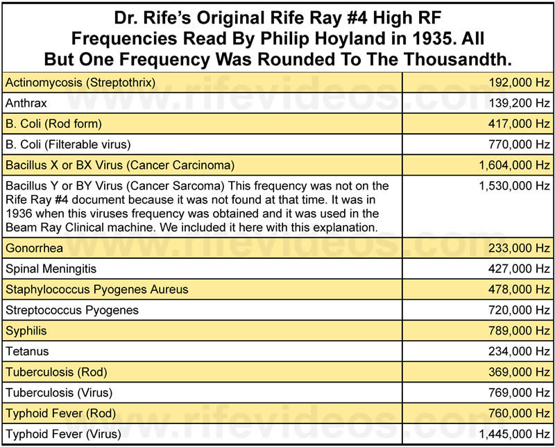 Dr. Rife's 1935 frequencies that were used in his Rife Ray #3 & Rife Ray #4, These frequencies were read in 1935 by Dr. Rife and his engineer, Philip Hoyland, from Dr. Rife's Rife Ray #3. These frequencies ranged from 139,200 Hertz for Anthrax to 1,604,000 Hertz for the Cancer 🦠