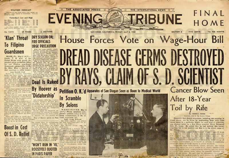 The Rife Ray #5 or Beam Ray Clinical instrument, shown above in the May 5, 1938 newspaper, was designed and built in the summer of 1936 by Philip Hoyland who was Dr. Rife's engineer.