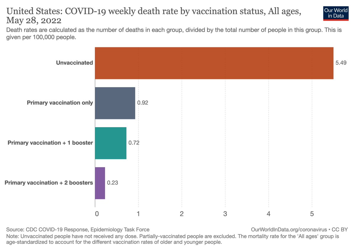 3. The magnitude of benefit has been consistent over time, for different Omicron subvariants. Here in May, across all ages, H/T @redouad, 96% reduction of death for 4 shots vs unvaccinated