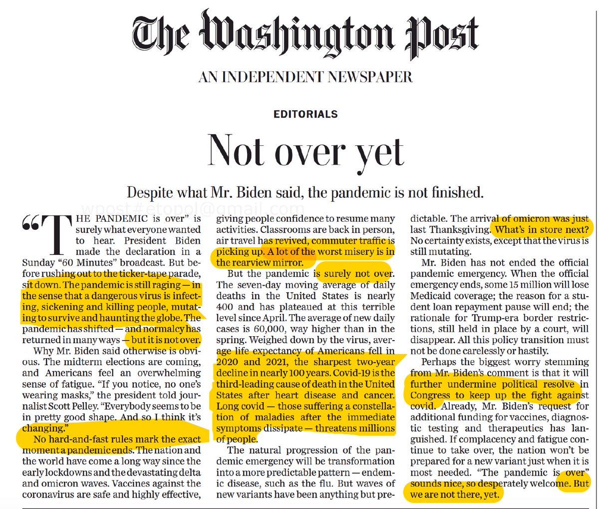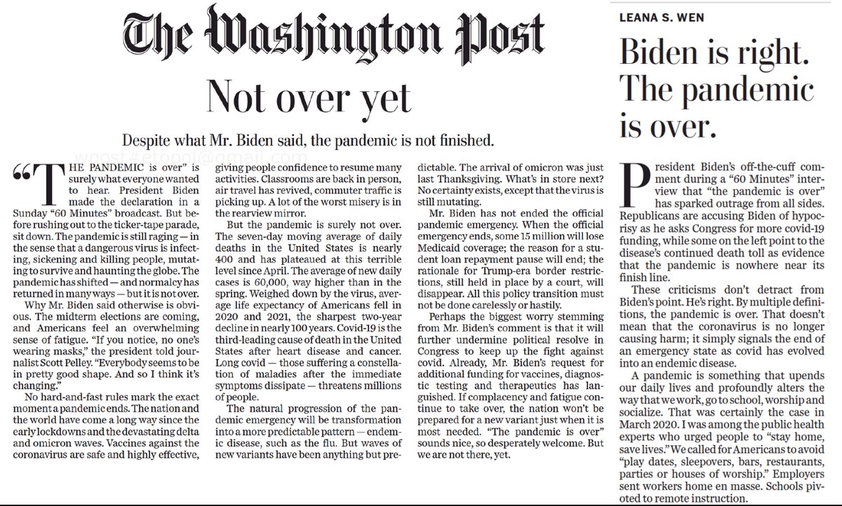 Wish this was true. What's over is @POTUS's and our government's will to get ahead of it, with magical thinking on the new bivalent boosters. Ignores #LongCovid, inevitability of new variants, and our current incapability for blocking infections and transmission