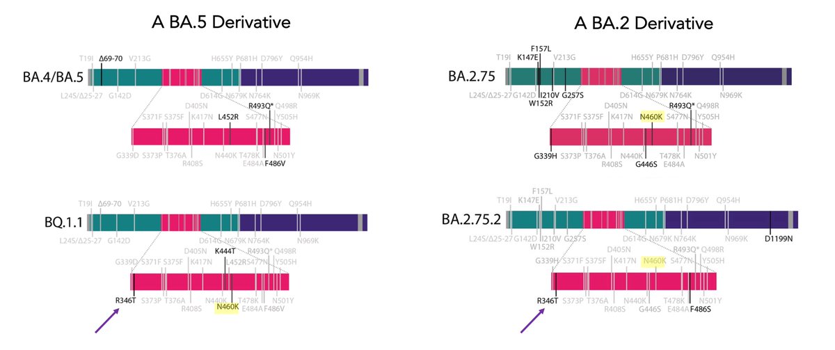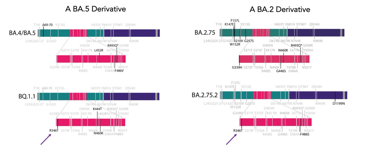 There are too many new #SARSCoV2 variants on the radar screen that show growth advantage vs BA.5, and 2 with extreme immune evasiveness to date. One is a BA.5 descendant, BQ.1.1; the other is derived from BA.2, BA.2.75.2. They share a RBD mutation, R346T