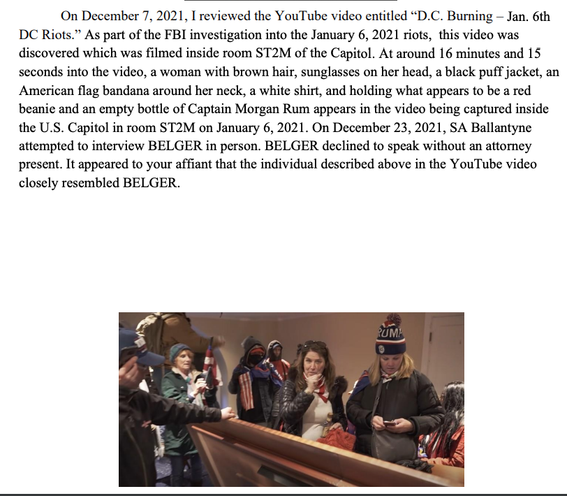 "a woman with brown hair, sunglasses on her head, a black puff jacket, an American flag bandana around her neck, a white shirt, and holding what appears to be a red beanie and an empty bottle of Captain Morgan Rum..." storage.courtlistener.com/recap/gov.usco…