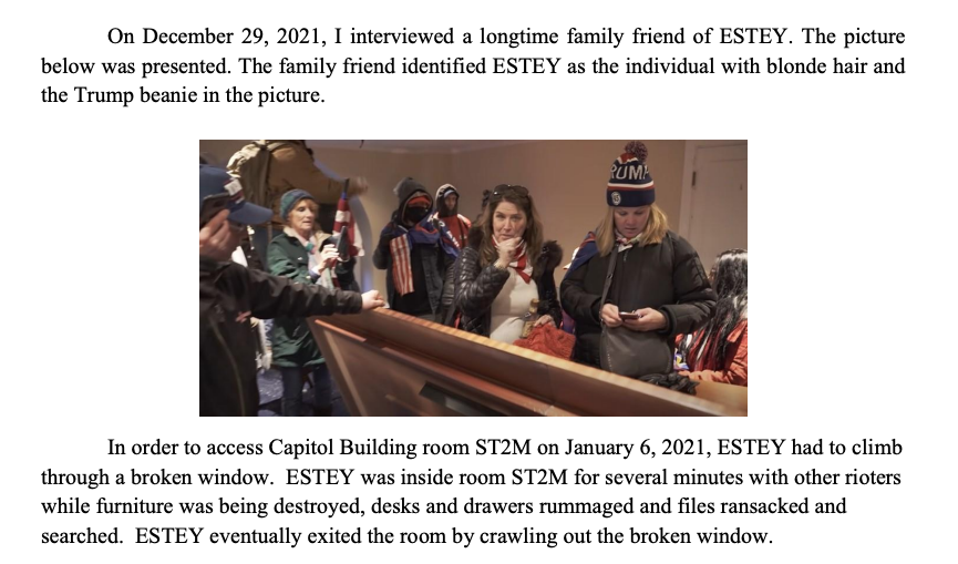 "In order to access Capitol Building room ST2M on January 6, 2021, ESTEY had to climb through a broken window. ESTEY was inside room ST2M for several minutes with other rioters while furniture was being destroyed, desks and drawers rummaged and files ransacked and searched."