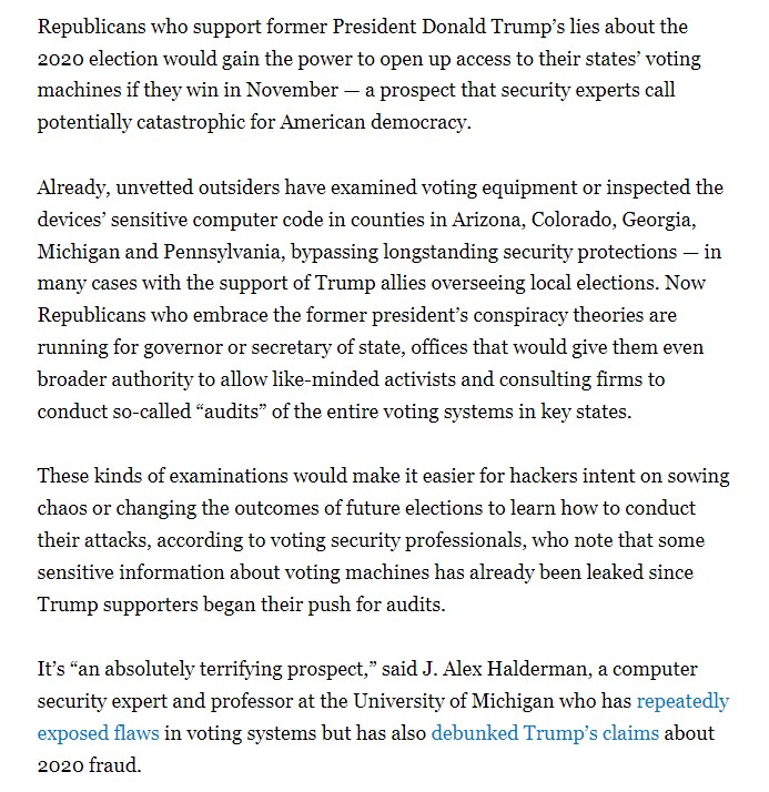 "There is an active effort ... to get people in office to provide unauthorized access to election equipment to untrustworthy parties," @LarryNorden told me. "This should be a matter of great concern to anyone who cares about our democracy."