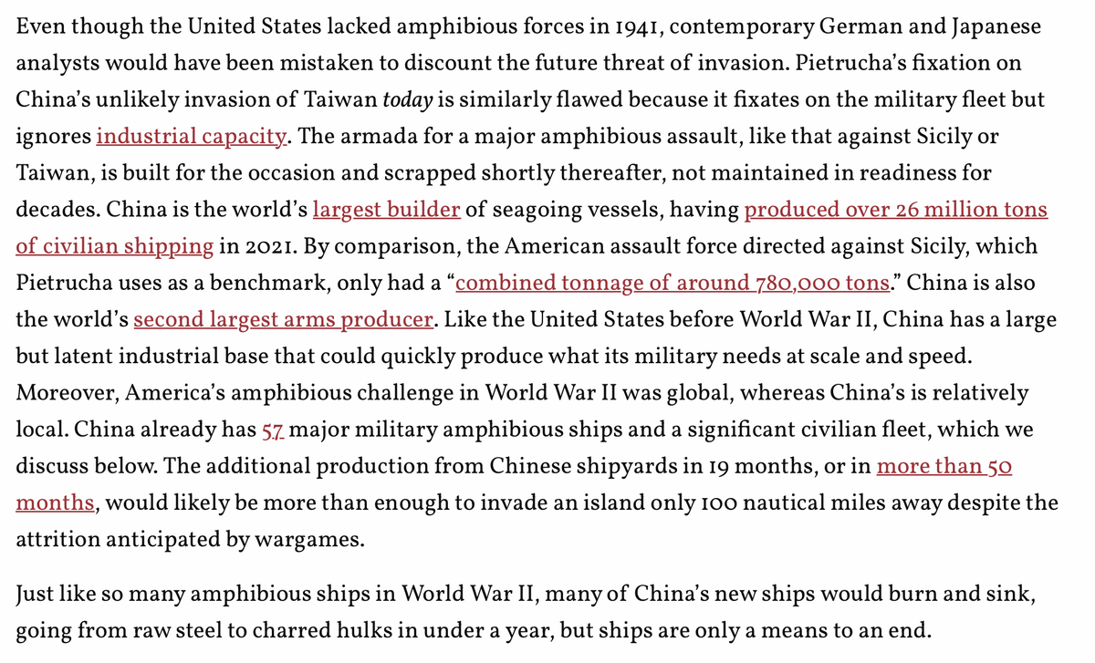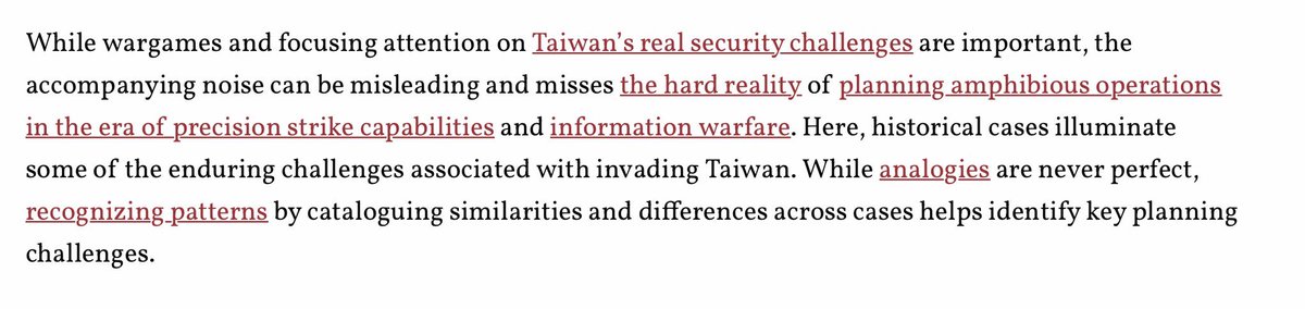 A few thoughts on an article I alluded to (ok, fine…subtweeted) elsewhere today - an assessment by Dr. Benjamin Jensen in @WarOnTheRocks on the risks China would run in attempting a Taiwan invasion, and the resources it would take to to do. warontherocks.com/2022/09/not-so…