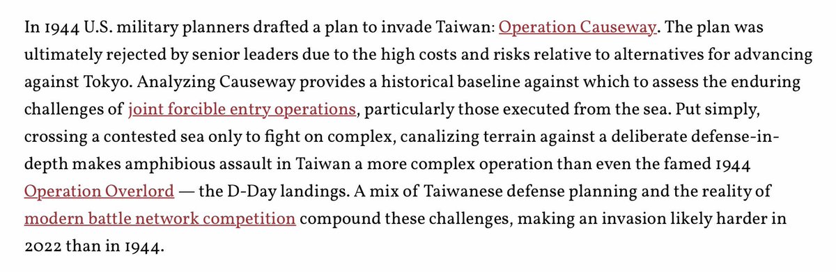 This comparison strikes a nerve for a number of reasons. First, I've seen the Operation Causeway comparison used before to downplay the risk of invasion - not just in the near term, but that China "probably will never have the capacity" to do so. thehill.com/opinion/intern…