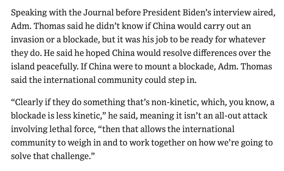 He said: “They have a very large navy, and if they want to bully and put ships around Taiwan, they very much can do that"... wsj.com/articles/china…
