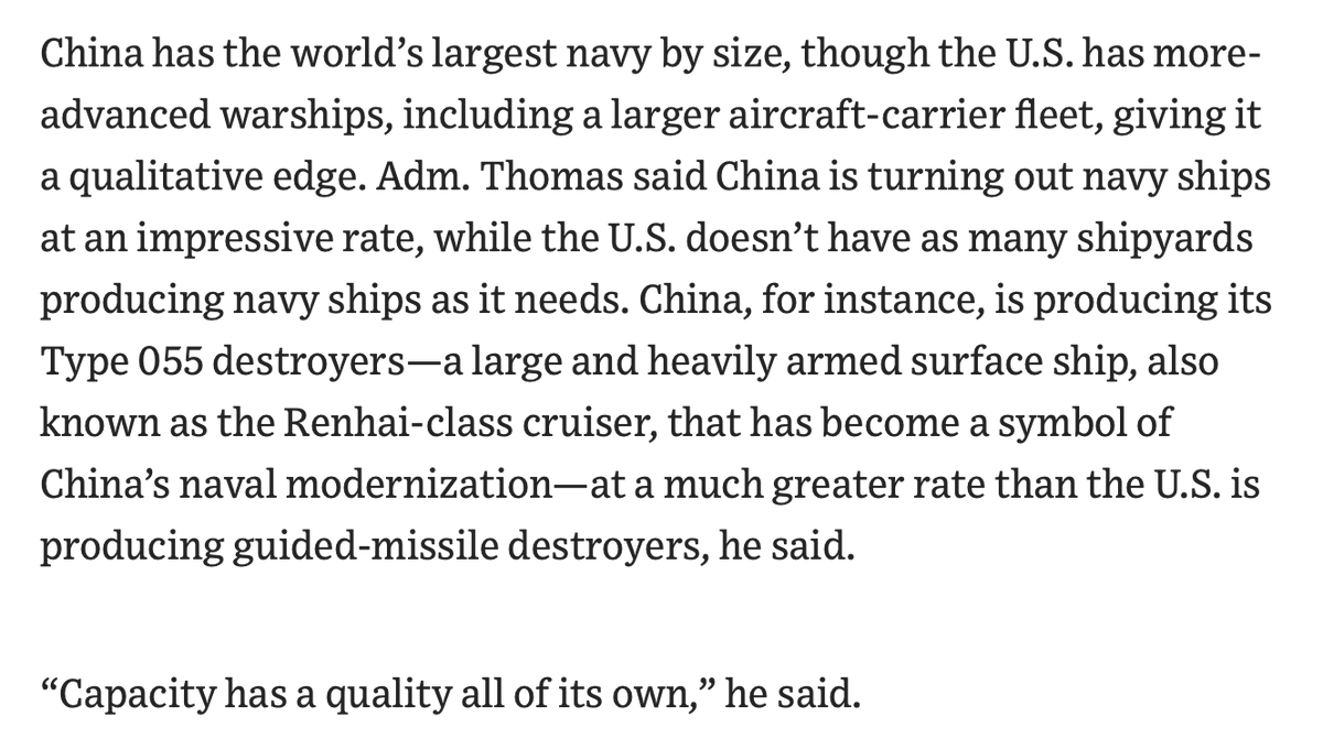 Interesting tidbit: "Adm. Thomas said China is turning out navy ships at an impressive rate, while the U.S. doesn’t have as many shipyards producing navy ships as it needs..."Capacity has a quality all of its own,” he said."