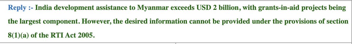 Basically, Indian government doesn't want to reveal what it is spending publicly budgeted aid money in #Myanmar on, because it believes that could harm #India's interests, foreign relations or incite an offence. Bit absurd. 7/n
