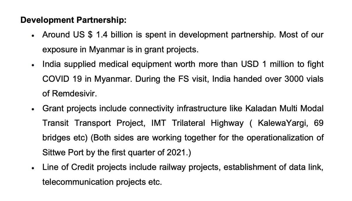 For #India, #Myanmar has been a key development partner in the neighbourhood. Since the last 1 decade & half, Delhi has spent more than $2 billion in various development projects in Myanmar (connectivity, border area dev, training, etc.).