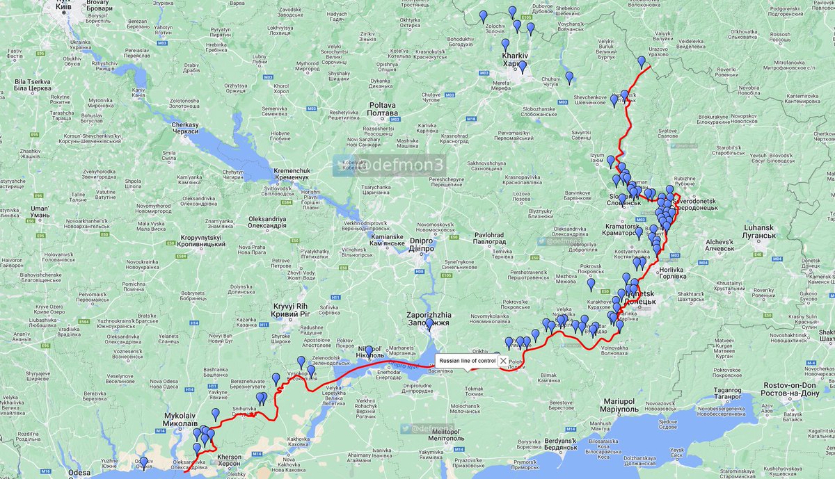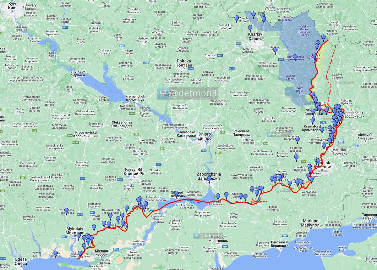 Blue marker is geolocated video of UA forces filming a RU jet being shot down.