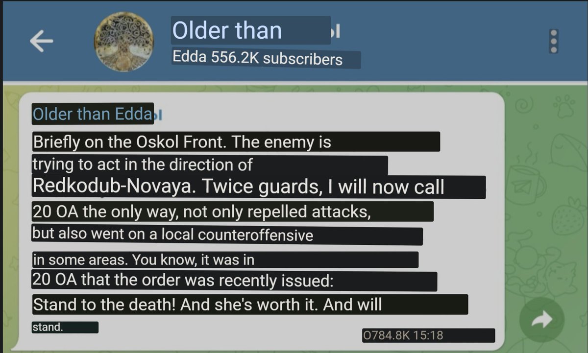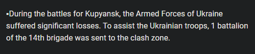 The AFU repulsed an attack in the area of Petropavlivka and GSUA reported a shelling in the area of Podoly. This would indicate further AFU expansion of the Kup'yans'k bridgehead, contrary to what Ru channels claim. There is also local telegram chatter confirming this.