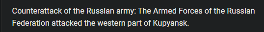 RU pushing back in the Kup'yans'k area according to Russian channels, I have not really seen any evidence of it.