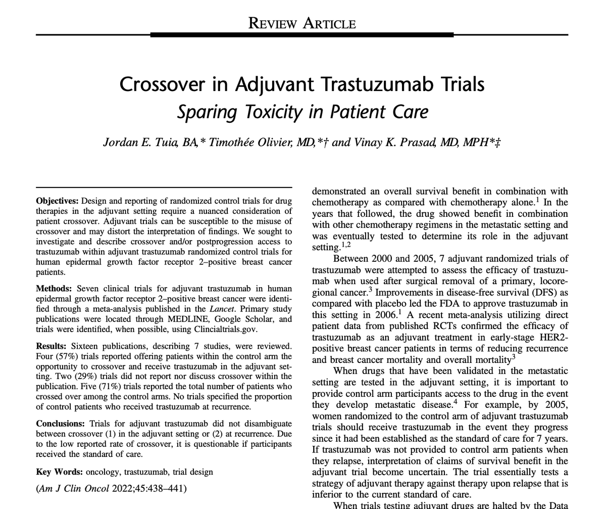 When the adjuvant trials for Traztuzumab were run, T was already standard of care for women presenting with recurrent, metastatic disease; Thus, any woman who relapsed should get T, and T upon relapse will affect OS