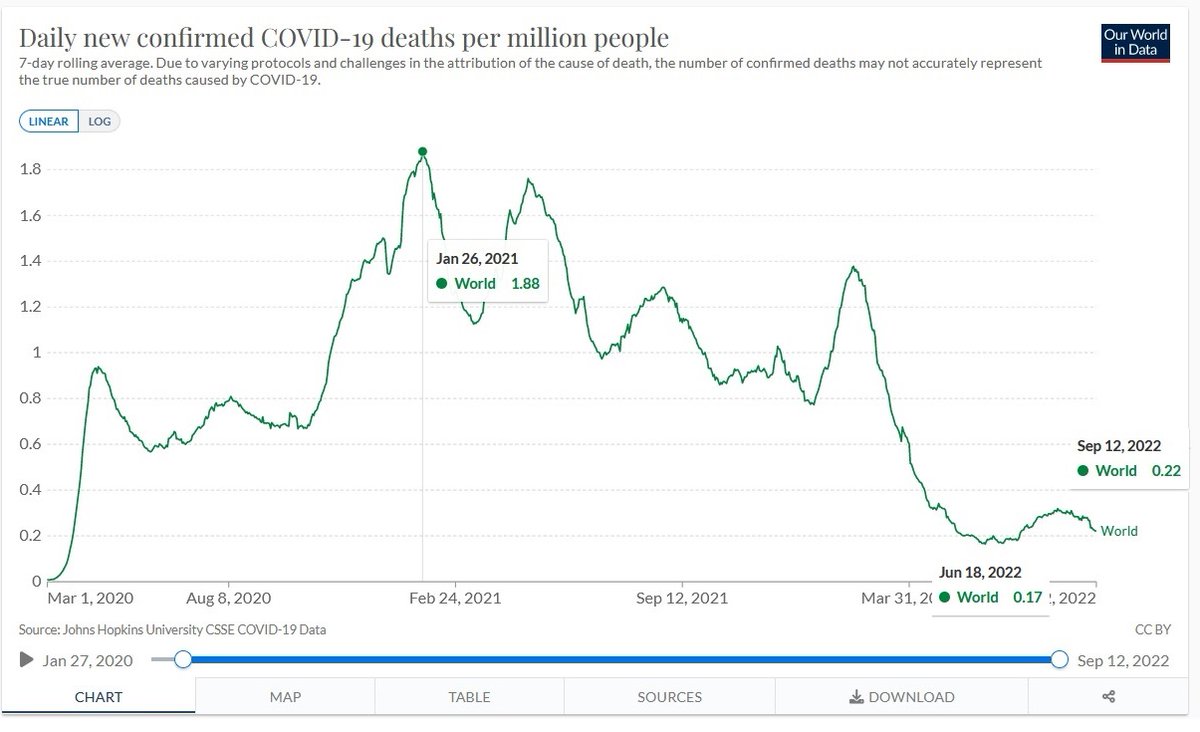3) As the chart below by Our World in Data shows, in fact, #COVID deaths were at a lower level the week ending June 18. Still, the chart does show on Sept. 12, the global fatality rate stood at 0.22 deaths per million population, down from the peak of 1.88 on Jan. 26, 2021.