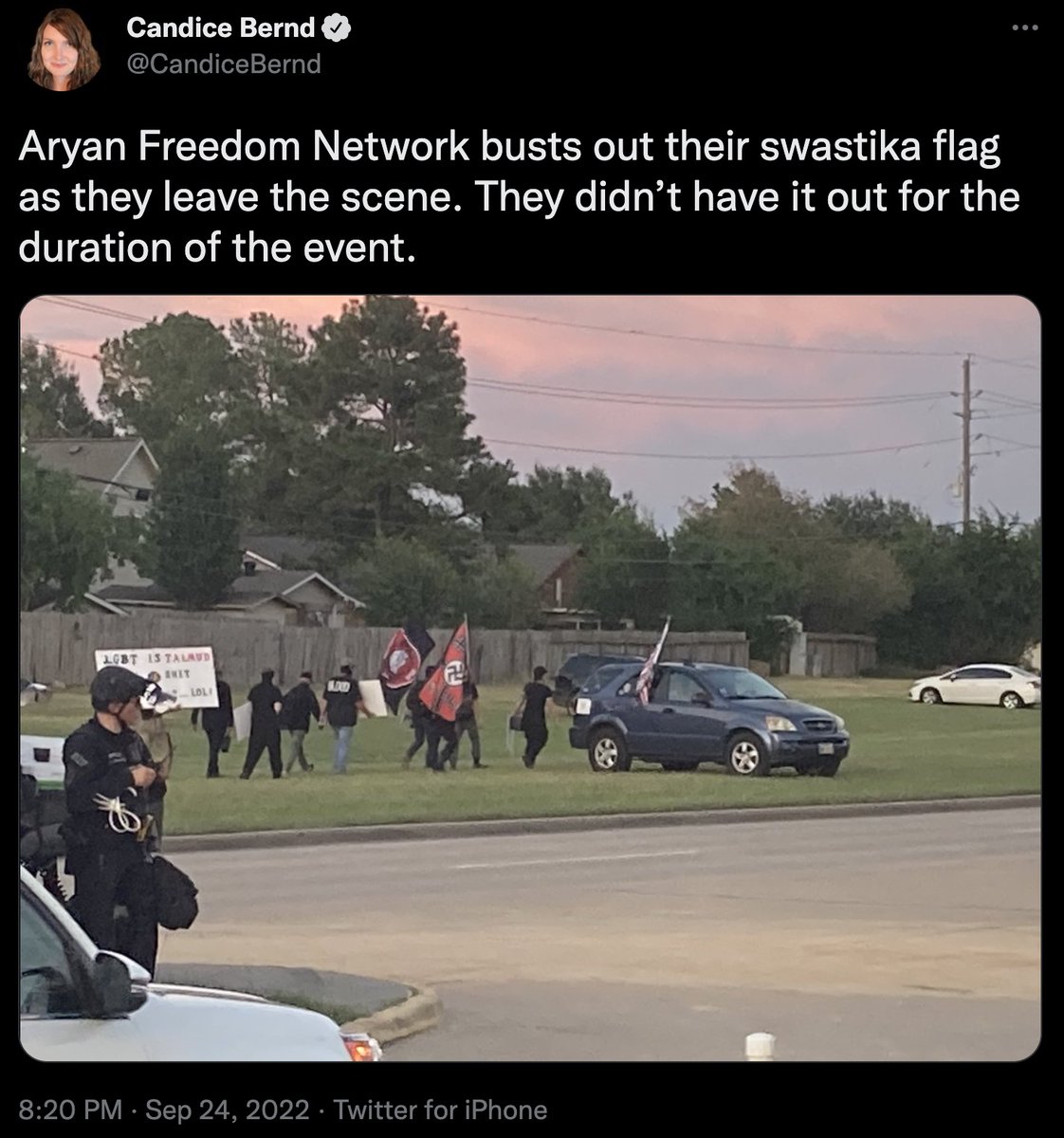 Candice Bernd reports that a small neo-Nazi group was among those who showed up to protest the First Christian Church of Katy, Texas for hosting two drag events (a family-friendly one and a 21+ adults-only one after).