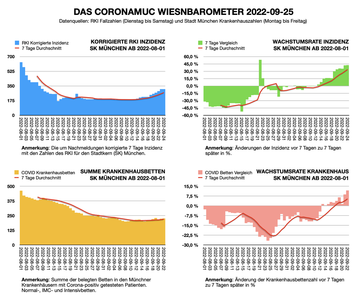 Zweiter Wiesnsonntag. Wie schon seit Monaten, werden am Wochenende keine Fallzahlen von der Stadt oder dem LGL/RKI gemeldet. Die einzig neue Zahl, die es gibt: In Bayern ist die 7 Tage Summe der Krankenhauseinweisungen mit 901 um 31,7% höher als noch vor einer Woche.