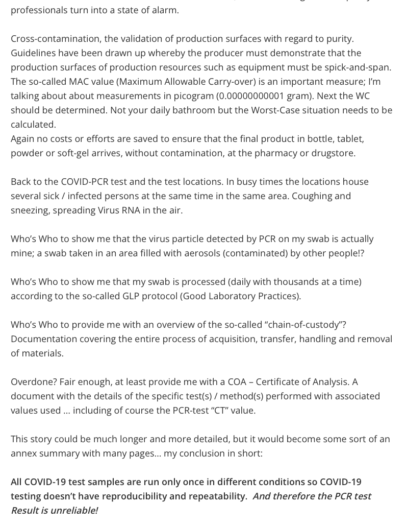 4) PCR test "Alle COVID-19 testmonsters worden slechts één keer in verschillende omstandigheden uitgevoerd, zodat de COVID-19 test geen reproduceerbaarheid en herhaalbaarheid heeft. En daarom is het resultaat van de PCR-test onbetrouwbaar!" thevirus.wtf/pcr/ (item-38) 4/5👉