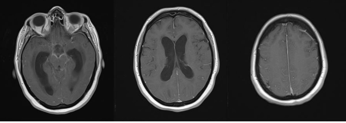 They undergo MRI brain, T1 post gad representative images shown. Patient with meningitis, ependymitis and ventriculitis & known communicating ๐ง ๐ง (for the difference between communicating and non-communicating (aka obstructive) hydro, see: