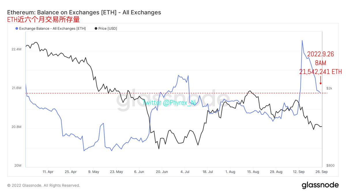 而从交易所近半年的 #BTC#ETH 存量走势也能发现,虽然最近BTC的抛压更胜一筹,但因为总体的库存水平仍然在较低的位置,所以产生的压力并不大,而ETH虽然的库存量在快速的拉低,可当前还是处于较高的水平,甚至还没有低于LUNA事件时的存量,而距离底部的量还很遥远,这也是对于ETH最不利的地方。