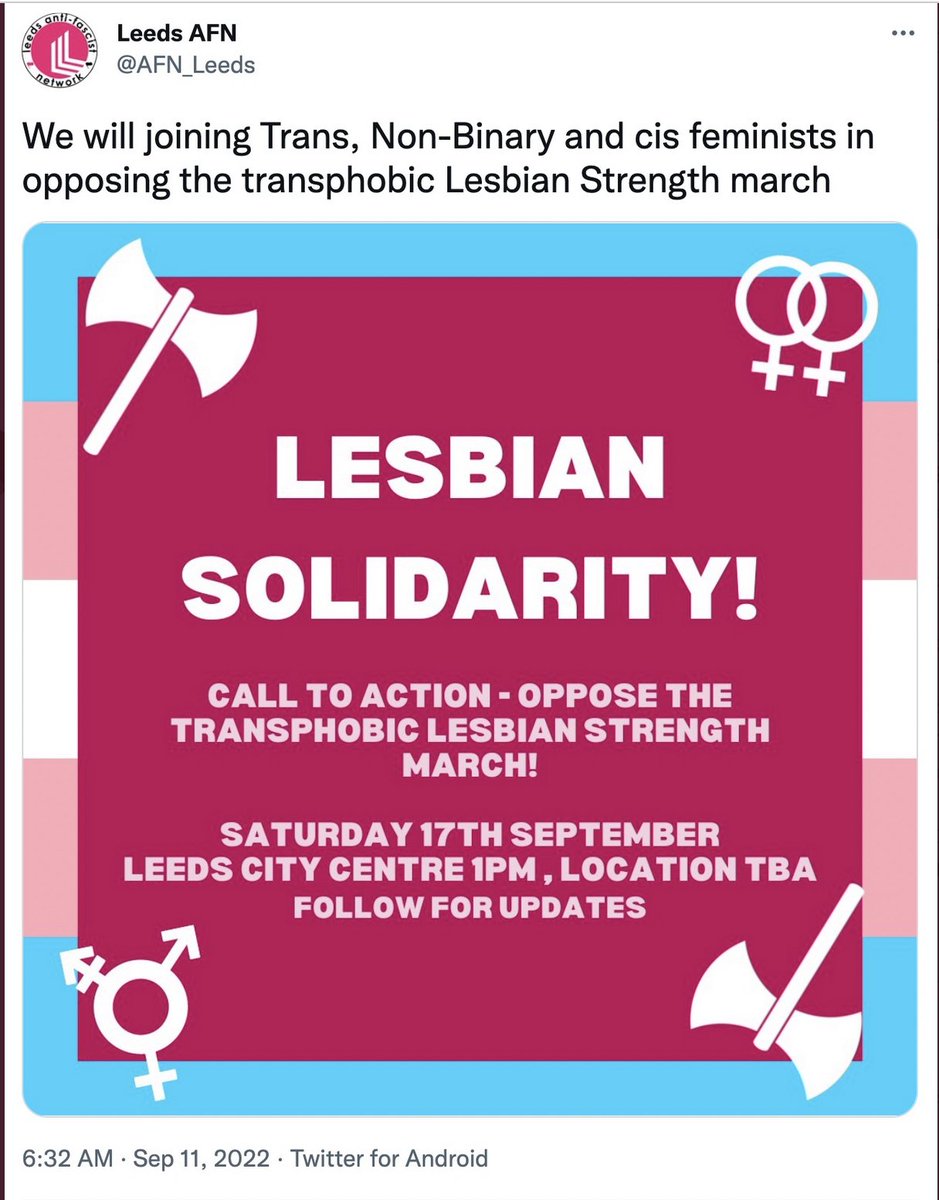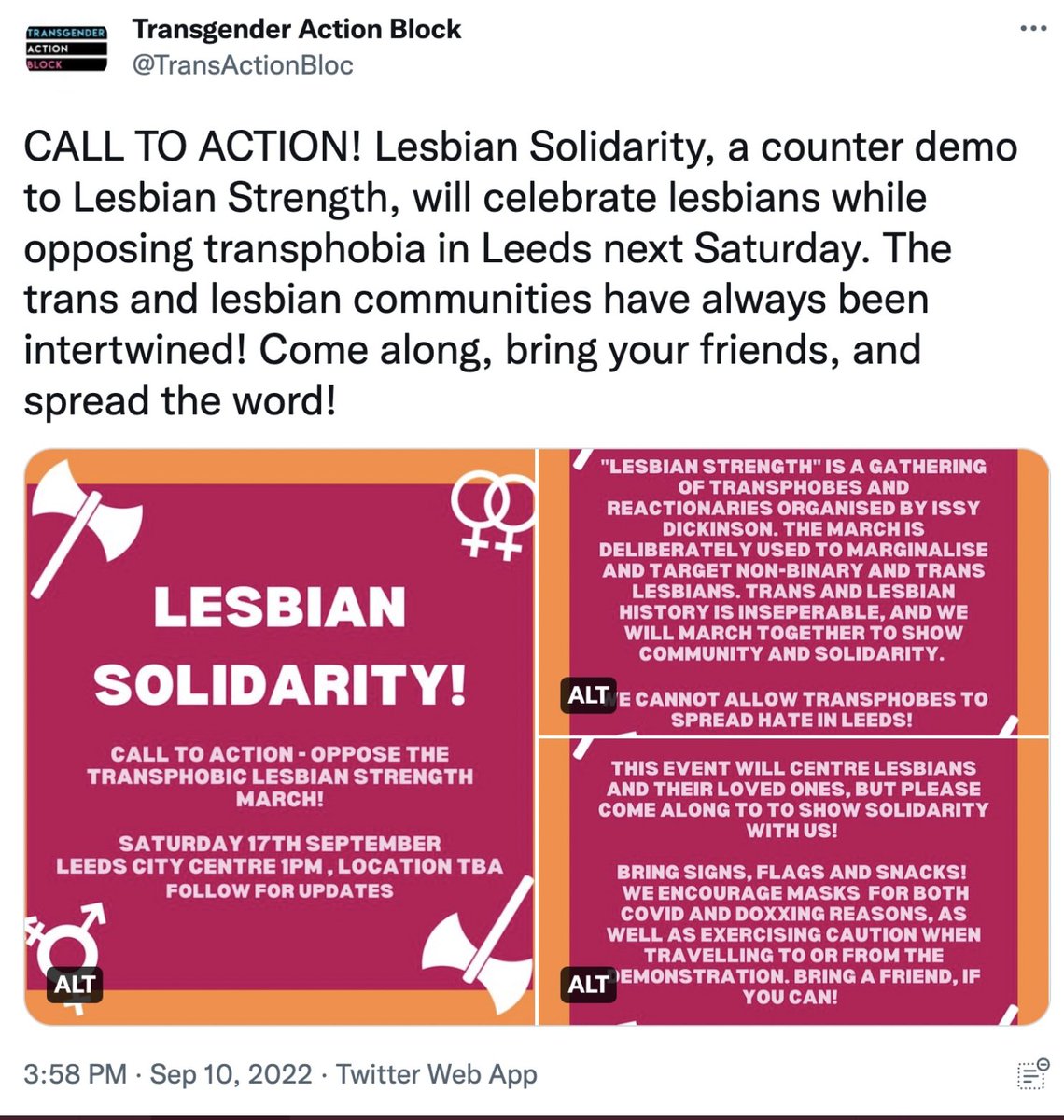 The Lesbian Strength Collective, a lesbian group in Leeds, England, has released a statement about safety concerns about their rally on Sept. 17 at 2 pm at the City Square. Leeds #Antifa & the Trans Action Bloc accuse them of being transphobic & have promised to confront them.