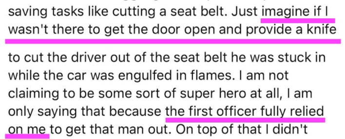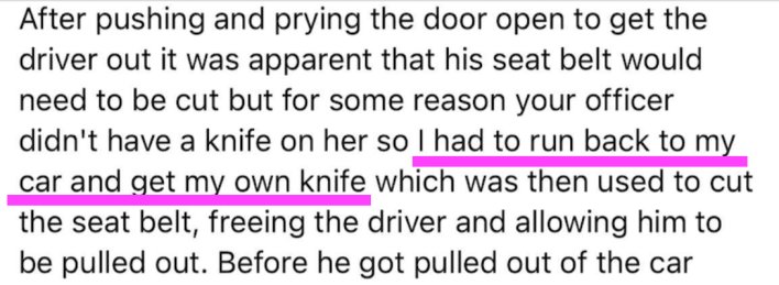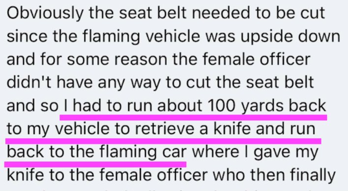 Ethan, who is morbidly obese, told @telegramdotcom that he ran back to his car, retrieved his knife, and cut the victim's seat belt as the car burned. He wasn't shy about taking credit for saving the man's life. "Imagine if I wasn't there. The officer fully relied on me."