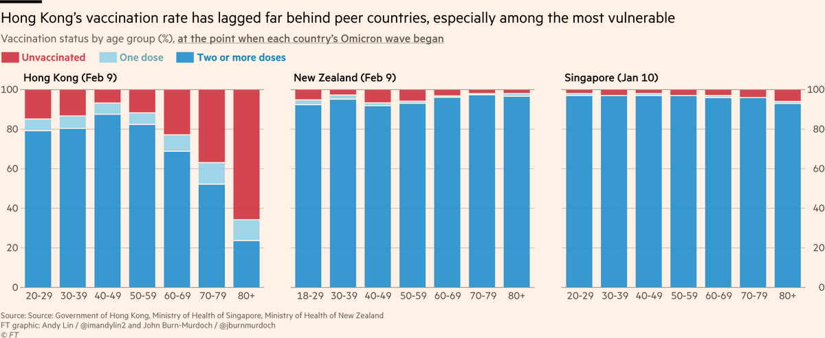 3.כמה גבוהה? למעלה מ-4% תמותה מתוך המקרים הידועים, חדרי המתים מלאים. שיעור מזעזע. הסבר: אומיקרון איננו זן קל יותר בהשוואה לזן הראשוני, אנחנו פשוט חסינים יותר - בגלל חיסון, ו/או הדבקה קודמת. בסין אין כמעט הדבקה קודמת, החיסון פחות יעיל, ו**הקשישים לא התחסנו** טבלה של @jburnmurdoch