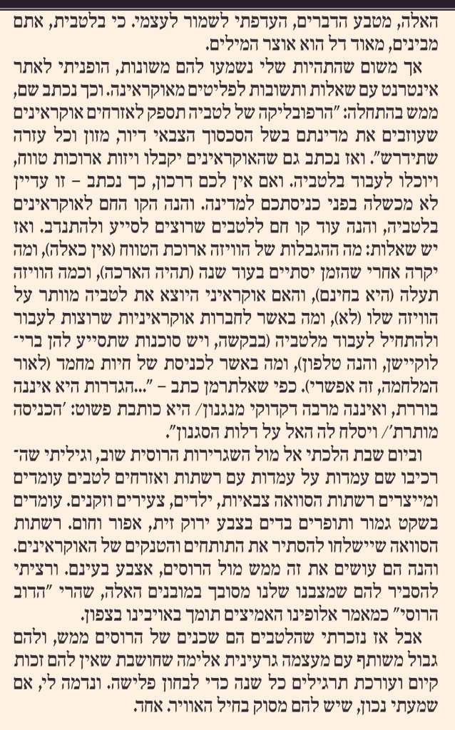 זו איננה מלחמת העולם השנייה, האוקראינים הם לא היהודים ואני לא אלתרמן. אבל כאשר עמדתי בסוף השבוע מול מרכז הפליטים בבירת לטביה ריגה, חשבתי על שירו הידוע "הלשון השוודית" (בסוף השרשור, העתק). חשבתי על אומה קטנה שלא רק שרוסיה מסייעת לאויביה בצפון; רוסיה היא האויב בצפון ממש.