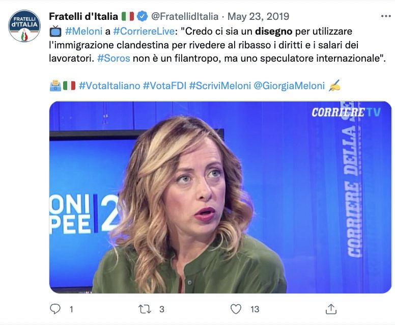 7/ **כמובן שלאומנות - ששוב, איננה יכולה לשרוד בעולם גלובלי, בלי להיות מושמדת או להשמיד אותו - חייבת למצוא את האויב, הזר המטמא. מלוני מדגישה שוב ושוב "ספקולנטים בינלאומיים". בימין קיצוני זה שם קוד ליהודים, וליתר דיוק סורוס. ראו פה.