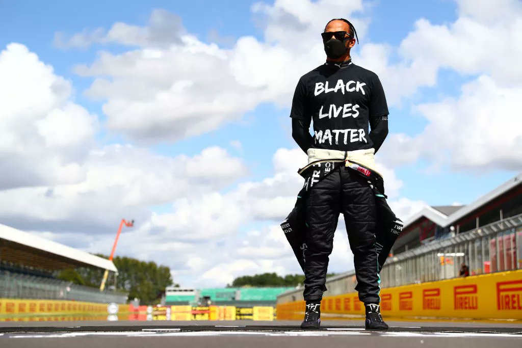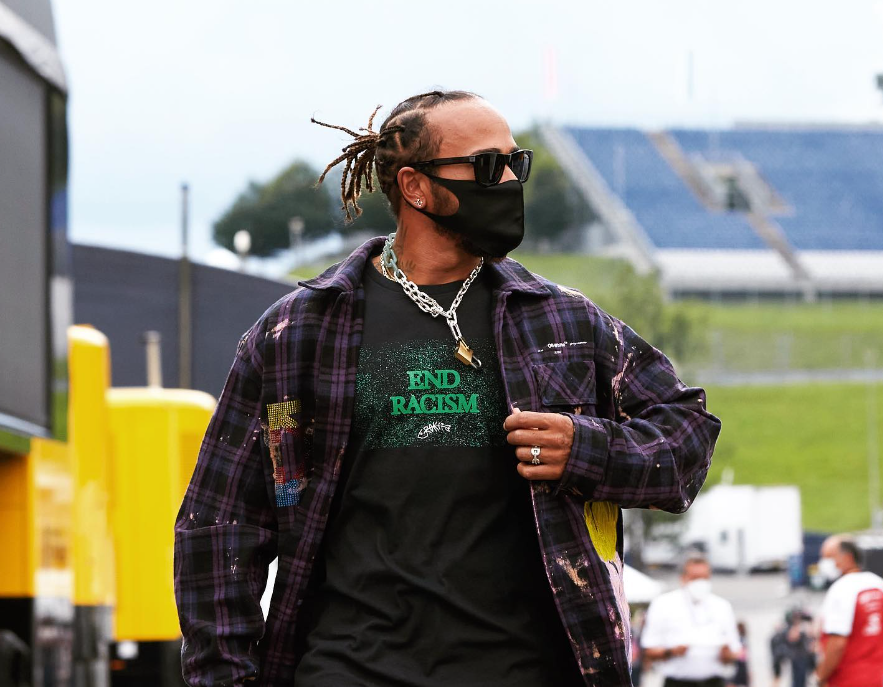 Além de seu estilo pessoal, Lewis usou de seus momentos nos pódios para usar blusas com mensagem pedindo justiça para pessoas negras mortas pela brutalidade policial bem como o fim do racismo.