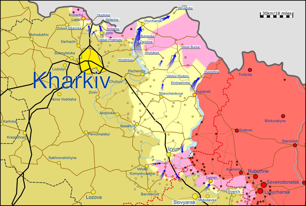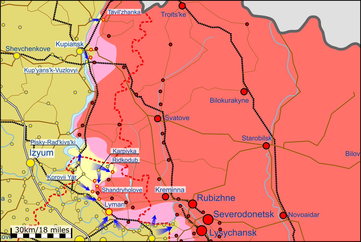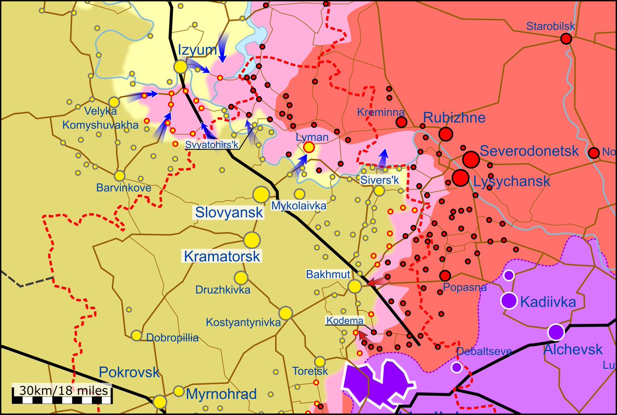 Areas south of Izyum are likely to have been liberated by πΊπ¦. Any π·πΊ remaining in there are cut off from the rest of π·πΊ occupied Ukraine as they have no access to crossings of the Siverskyi Donets.