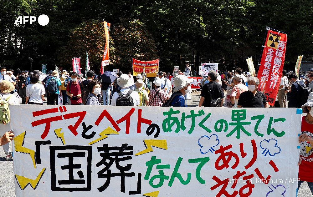 VIDEO: Hundreds of protesters against the publicly funded state funeral of former Japanese Prime Minister Shinzo Abe gather in a street near the Nippon Budokan.