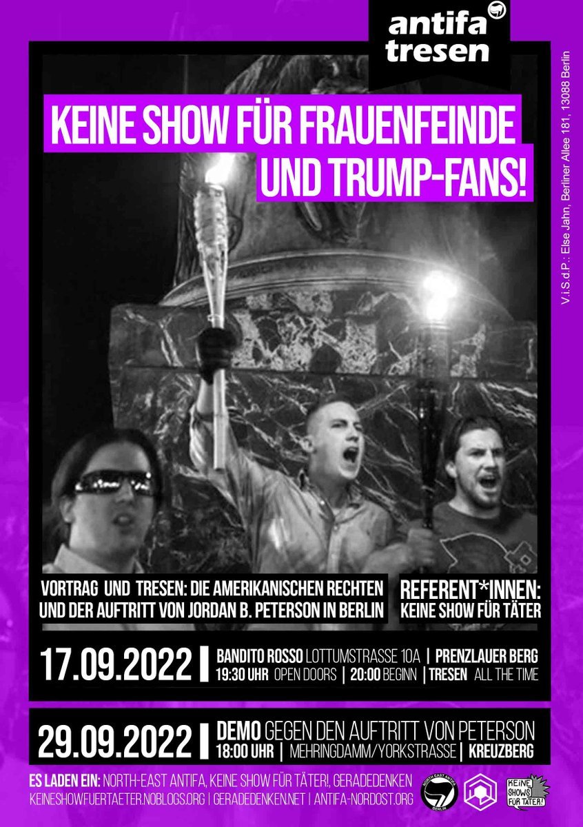 Berlin Antifa already had a training on Sept. 17 to prepare for the direct action against Jordan Peterson's Berlin event at the Tempodrom venue. Antifa will meet at the corner of Mehringdamm & Yorckstrasse at 6 pm on Sept. 29.